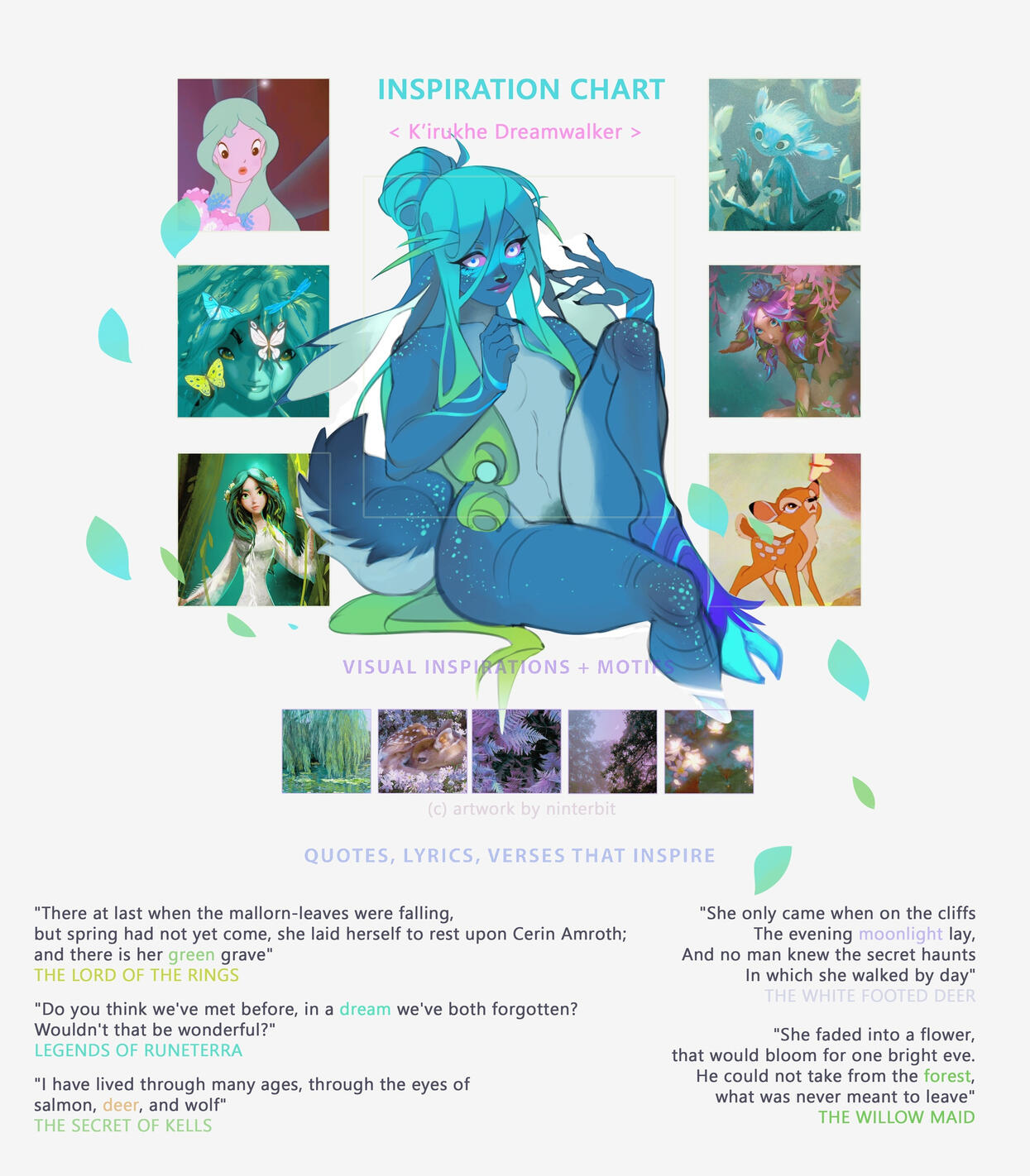 Fawn of Moonglade, Lily of Ardenweald, Emerald Sprout - Ki is known by many names. Ever-changing by the Emerald Dream, they resemble a child of Malorne as much as a child of Elune. Whenever she goes, critters follow them, as if she was their own mother. Once emerged from the deep forests of Kalimdor, she’d be seen prancing around trying to fool the mortals with games and tricks of her own - harmless in some ways, and deadly to others.Fae in nature, Ki is open and flirty, though hopelessly devoted to his betrothed. Bound by strings of Life & Death, K’irukhe and Velkrath Clein of the Ebon Blade walk hand by hand - wherever a doe steps, lupine’s dark shadow follows, ready to devour anythings on it’s sight. A relationship complicated by a servant of Light, Xanara the Seeker, who sworn to protect the virtue of her fair maiden.Although ever so playful & forgetful, K’irukhe is spiteful & vindictive when it comes to their prey - be it the mere mortals of the Horde who dare to trespass Kaldorei borders, or cosmic invaders ready to hurt Nature, she’d haunt them down with the exceptional malice. With a single branch taken from G'Hanir, the Mother Tree, Ki spots a lantern to attract and guide the lost souls of the forest.A near immortal being, Ki would go through thousands of years without a care in the world, forgetting each partner to share bread or bed after years passing, falling back into slumber each time. Her lover’s demise was a wake up call - and his unholy ressurection a first purpose in a life without any. Now he ventures the lands of Azeroth & beyond to find a cure for the curse of Undead, uncovering the teachings of Druidism from all realms. But fawn's life is on hold - for she's nothing but a sprout of a World Tree, doomed to fall into slumber once again, and grow - this time, for eternity. HOOKS. Frequently Found In: Emerald Dream, Amirdrassil, Ardenweald, Val'sharah, MoongladeYou Might Know My Character If...: